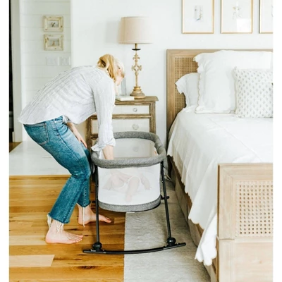 The Baby Delight® Slumber is a rocking bassinet designed for portability and for small spaces. The Slumber’s Charcoal Tweed fabric and clean lines make it sleek and modern, while the optional canopy and netting add design features for any situation – both indoors or out. All of our sleep products have mesh walls for visibility and breathability and the Slumber is no different. Depending on your preference, the Bassinet can be manually rocked or locked into a stationary position. The entire cover, along with the included sheet are machine washable. The Baby Delight® Slumber conveniently folds up in seconds and can be put into the included carry bag for travel or storing.