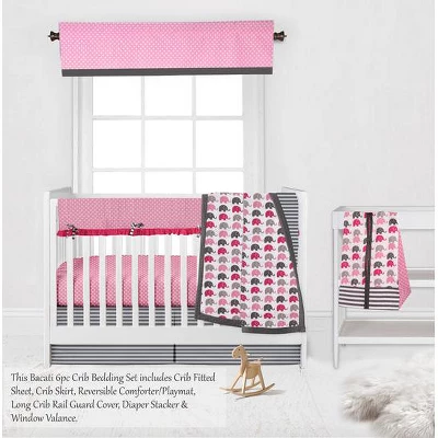 - This Bacati 6-piece Crib Set Includes Reversible Comforter/Playmat (33 x 43 inches), Crib fitted sheet (52 x 28 x 6 inches), Crib Skirt/Dust ruffle (13 inch drop) Diaper Stacker (holds more than 30 newborn diapers), Reversible Long Crib Rail Guard Cover (52 x 12 inches) and Window Valance (15 h x 56 w inches with 1.75 inch Rod Pocket) in fun, colorful and signature prints in 100 percent cotton 200 Thread Count percale fabrics. Designed in United States by Experienced Designers. Many coordinating items available to purchase separately in this Bacati Elephants Pink/Fuschia/Gray Bedding Collection.