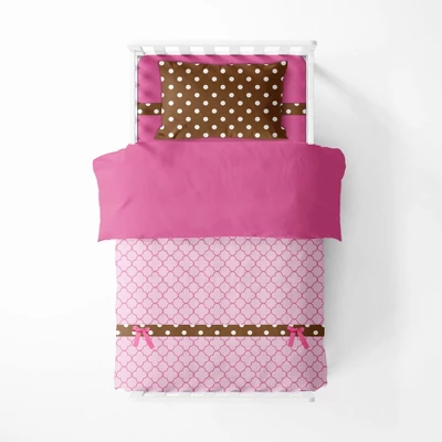 - This Bacati 4-piece Toddler Bedding Set Set Includes Reversible Oversize Comforter (42 x 55 inches), Toddler Bed Fitted Sheet(52 x 28 x 6 inches), Toddler Bed Flat Sheet(52 x 42 inches) which is fitted at the bottom to make the bed easily and Standard Pillow Case (20 x 25 inches) with french ties on the back in fun, colorful and signature prints in 100 percent cotton 200 Thread Count percale fabrics. Designed in United States by Experienced Designers. Many coordinating items available to purchase separately in this Bacati Buttefly Pink Chocolate Bedding Collection.