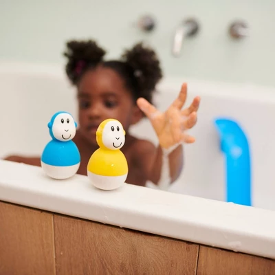 - Contains two bright and colorful wobbling baby bath toys. The Wobblers sink under the surface of the water then bob right out making bath time fun for everyone.