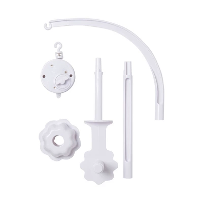 Encourage eye tracking and sound perception skills with this Cottontail Cloud Musical Crib Mobile by Sammy and Lou® . A pink and white moon and stars print on the banded mobile ring features two happy bunnies and two pink plush stars suspended from decorative white ribbons that slowly rotate to Brahms’ Lullaby. This mobile coordinates with the Sammy and Lou® Cottontail Cloud 4 Piece Bedding Set.