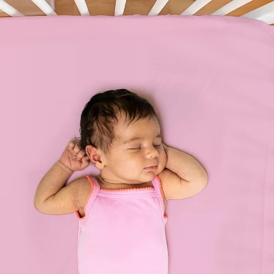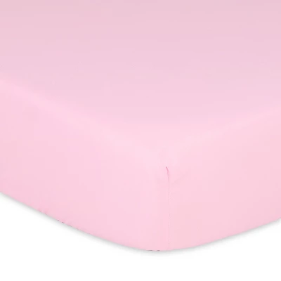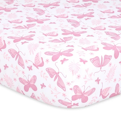 Add feminine whimsy to any nursery with the four-pack crib fitted sheet set by The Peanutshell. This collection features two printed and two solid sheet designs in a girly garden theme. Printed on a fresh white background, large pink butterflies flutter by between the leafy details in soft pink hues. In the coordinate print, smaller butterflies dance among more pink blossoms. The solid light and medium pink sheet options compliment most baby girl nurseries. Our microfiber fabric is as soft as it is stylish. The breathable and comfortable material is gentle on baby’s delicate skin. Each sheet has elastic trim around all 4 sides for a safe and snug fit on standard 52 in x 28 in. crib mattresses. Designed to be fade resistant and machine washable for easy care. Machine wash on cold with like colors on a gentle cycle and tumble dry on low heat to best preserve this quick-drying material.