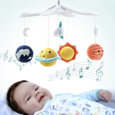 Spectacular Space Musical Mobile by The Peanutshell helps to promote baby’s auditory development, motor skills and visual stimulation. Our expertly designed nursery must-have features plush velour planets in primary brights, orbited by a rocket, moon and star under scalloped white arm covers. The digital music box plays snippets of 12 different lullabies to soothe your little one gently to sleep. Easily switch music on/off or between songs with the simple touch of a button. Two velour arm covers in white and navy blue are provided for a polished designer look. This item coordinates well with our 2 Pack Rocket / Shooting Star and 4 Pack Gray 840309713917Celestial fitted sheet sets. Requires two AA batteries that are not included.